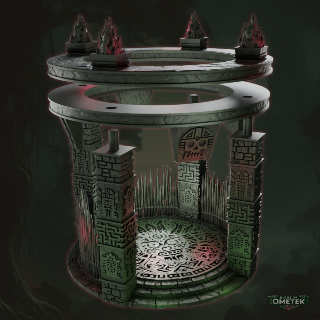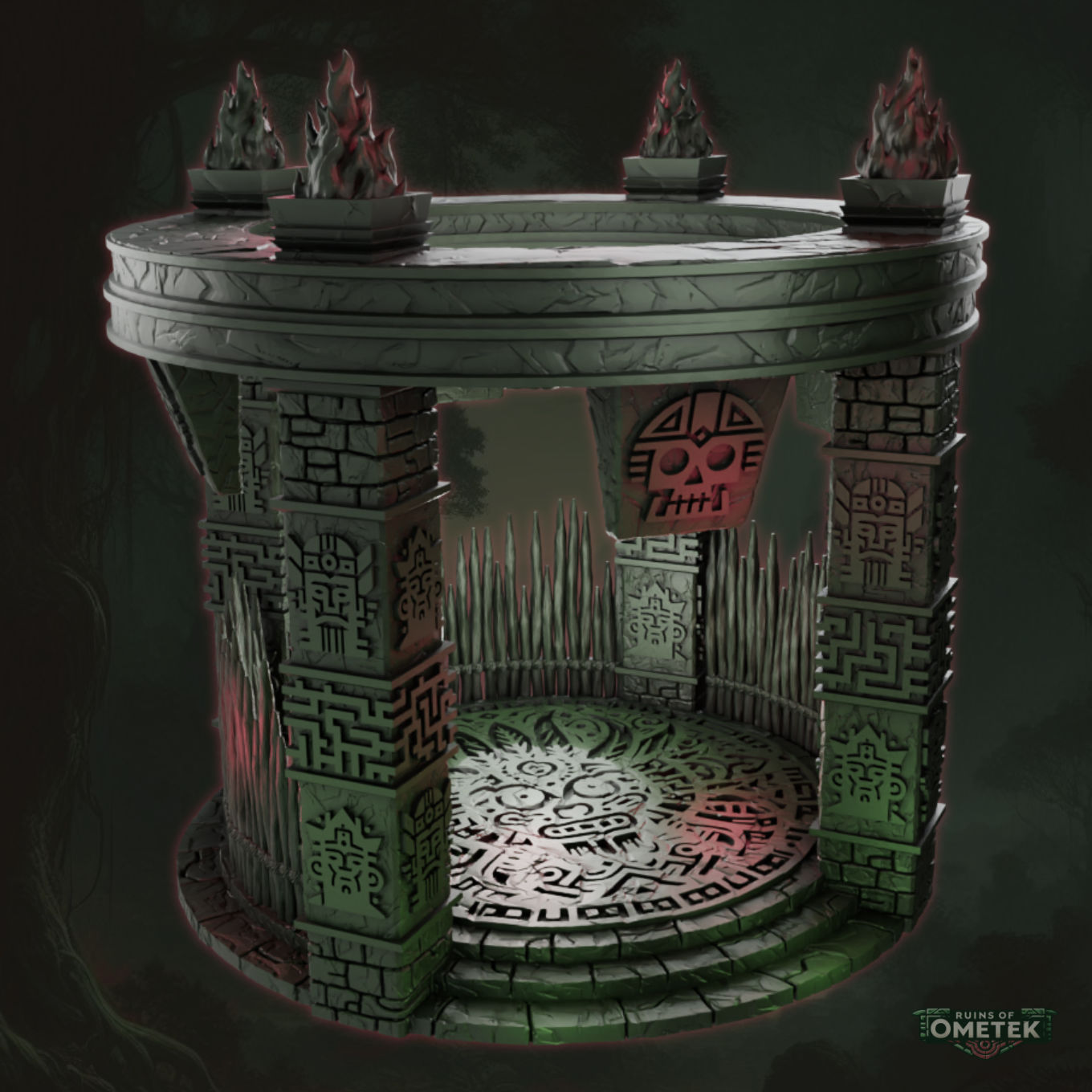 As featured in the Ruins of Ometek terrain set, encircled by sacred flames and sharpened stakes, this ritual arena demands blood. Two enter but only one earns the favor of the gods.