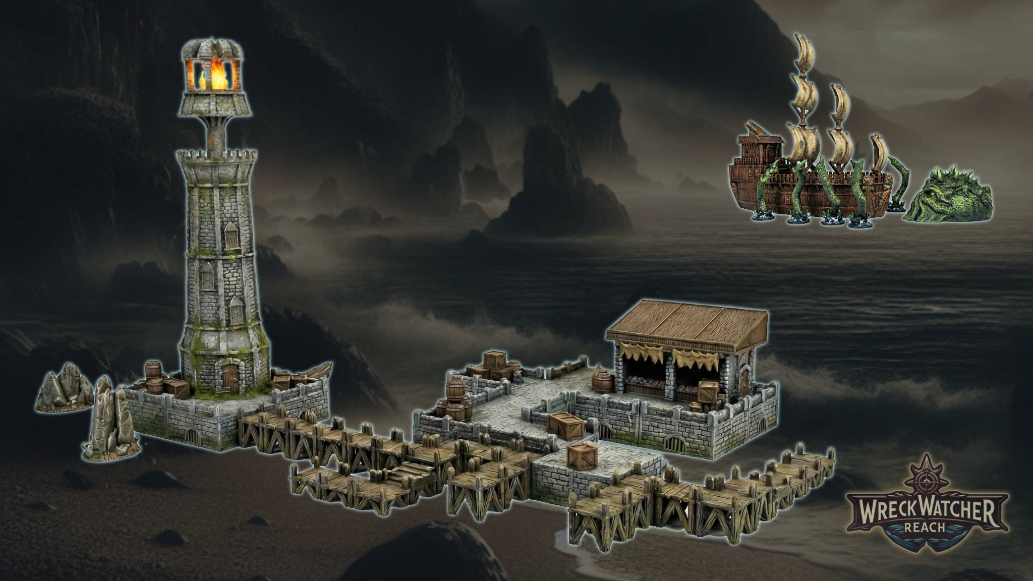 This Kickstarter features a Pirate Ship and Kraken to stage an epic ocean encounter! Plus a towering Lighthouse with a modular Port to create a unique harbour scene. -
