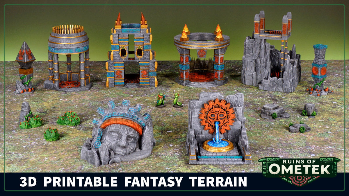 This Kickstarter features manually crafted terrain inspired by Mesoamerican culture. It includes a variety of medium-sized pieces and scatter terrain to bring your tabletop to life. -